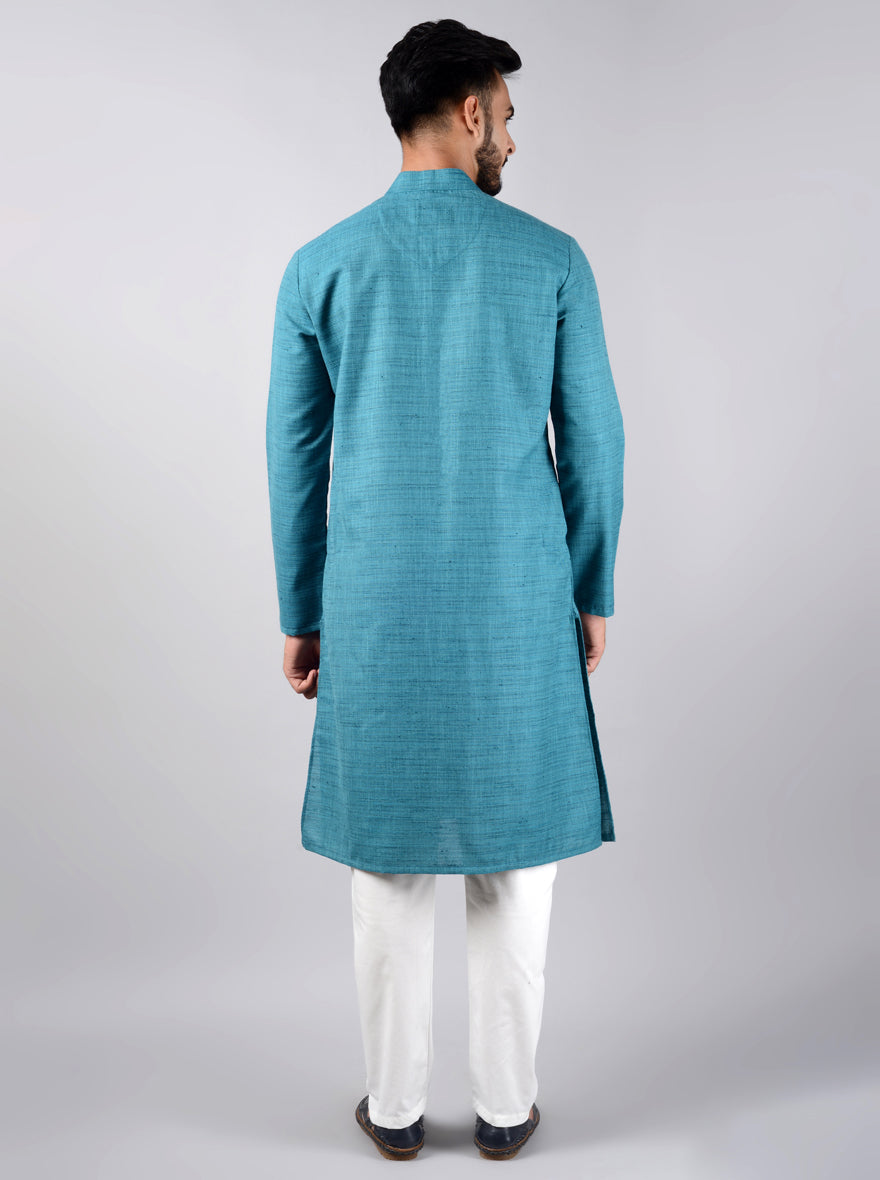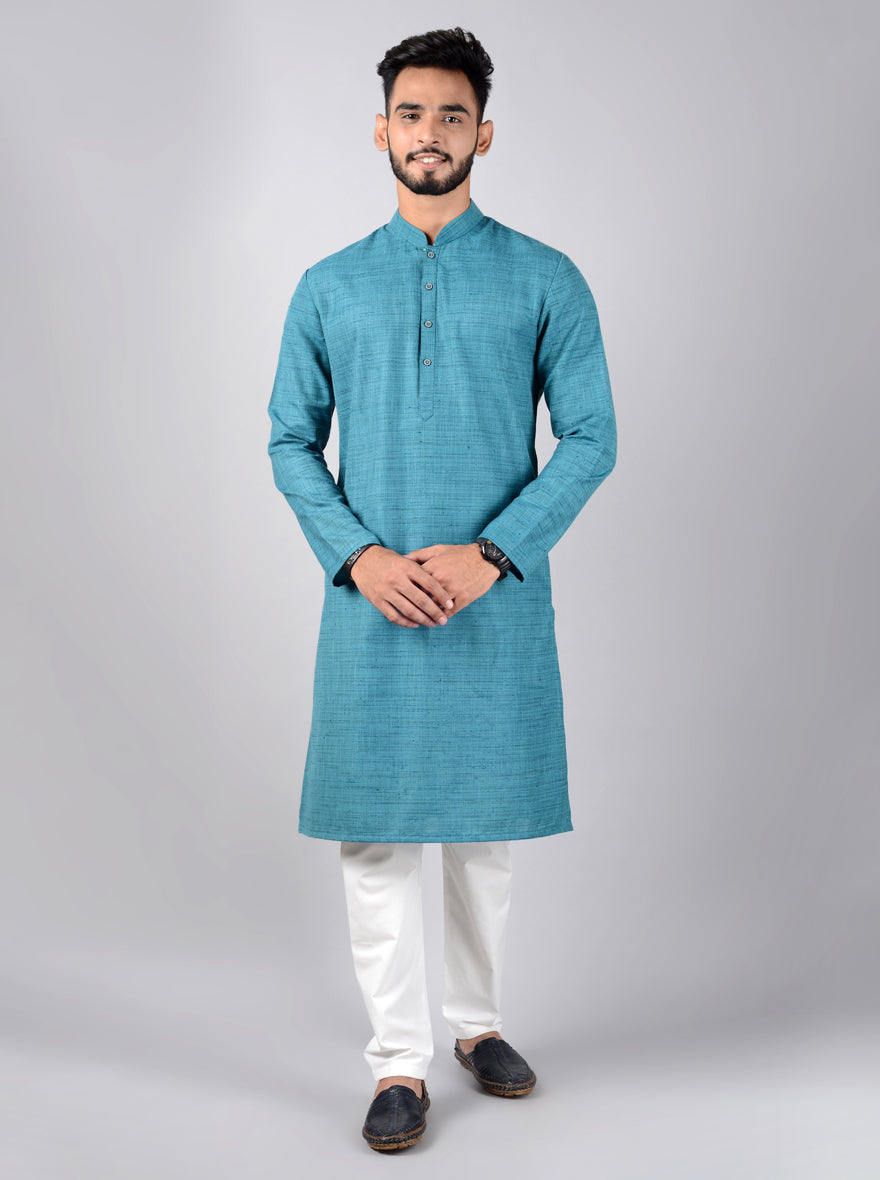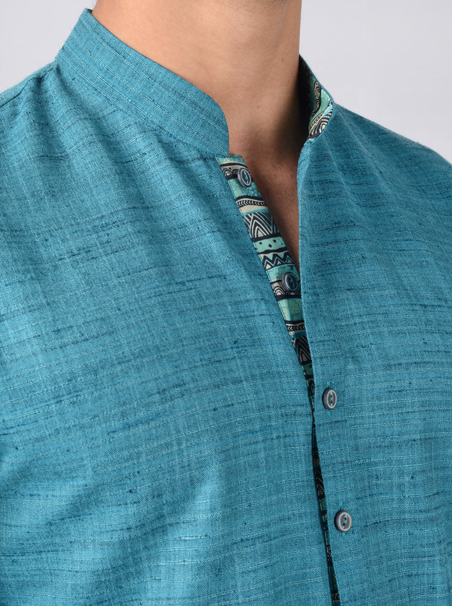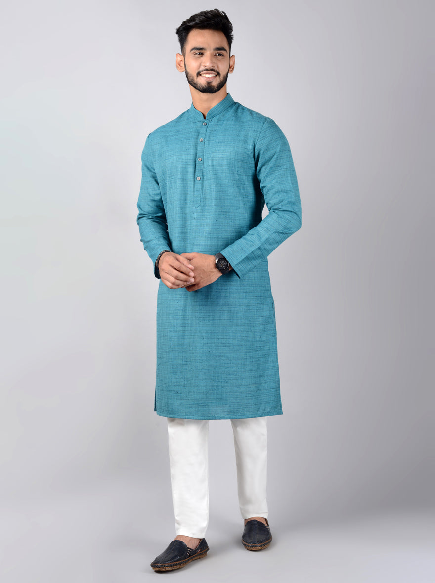 Details: A brilliant combination of style and comfort is this Rama Green Kurta from the latest collection of Azania. It features a mandarin collar and has full-sleeves. The kurta is adorned with a self-textured pattern which makes it a timeless choice. Perfect for weddings, special events and festivals. Made with premium quality Silk Blend, it promises to offer you the best of comfort all day long. Team it with a pair of Beige Jutti and you are all set to go.