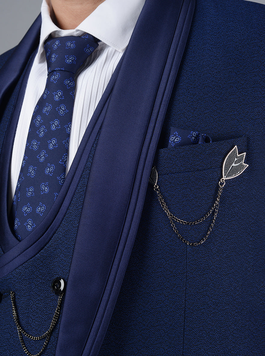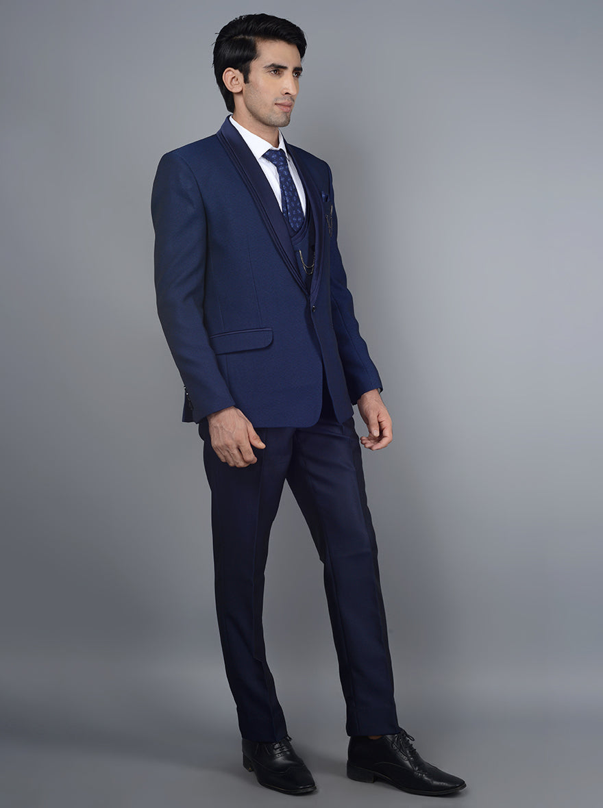 Details: This Royal Blue Suit from the latest collection of JadeBlue needs no introduction. Crafted with premium Terry Rayon Fabric that gives formal and partywear look as well as is comfortable. Featuring one button for closure along with three pockets on blazer and white shirt & vest. Self-designed on the Blazer. Offers a classic fit for a look with a collar. Perfect for Formal Dinner and other occasions.