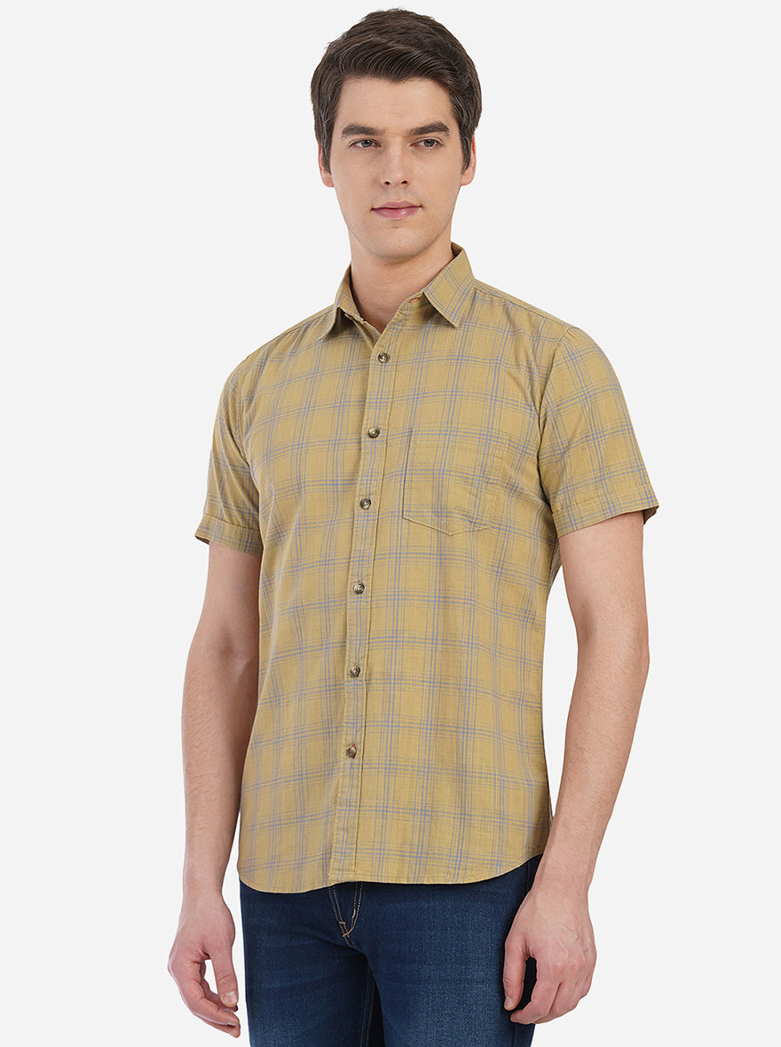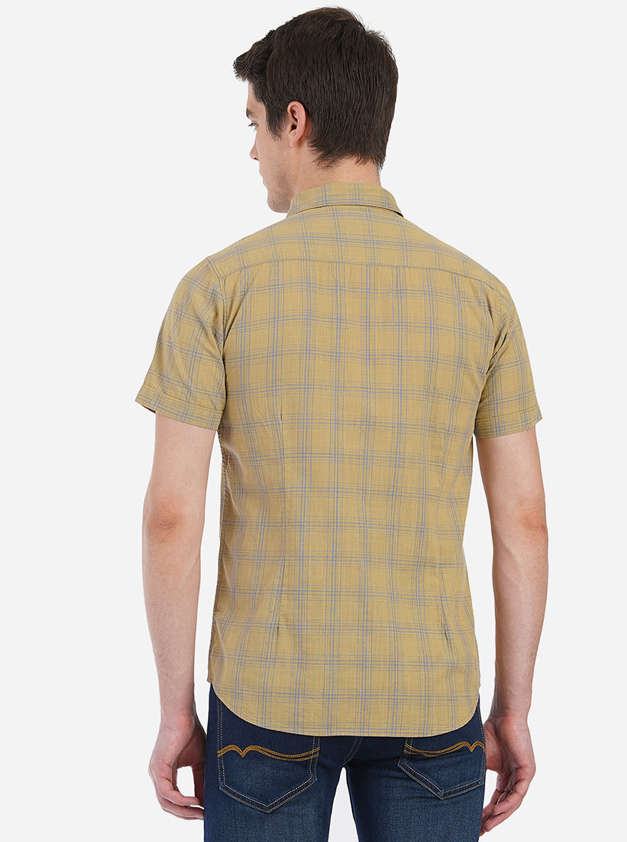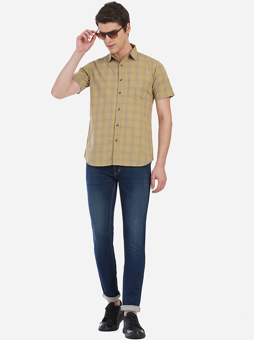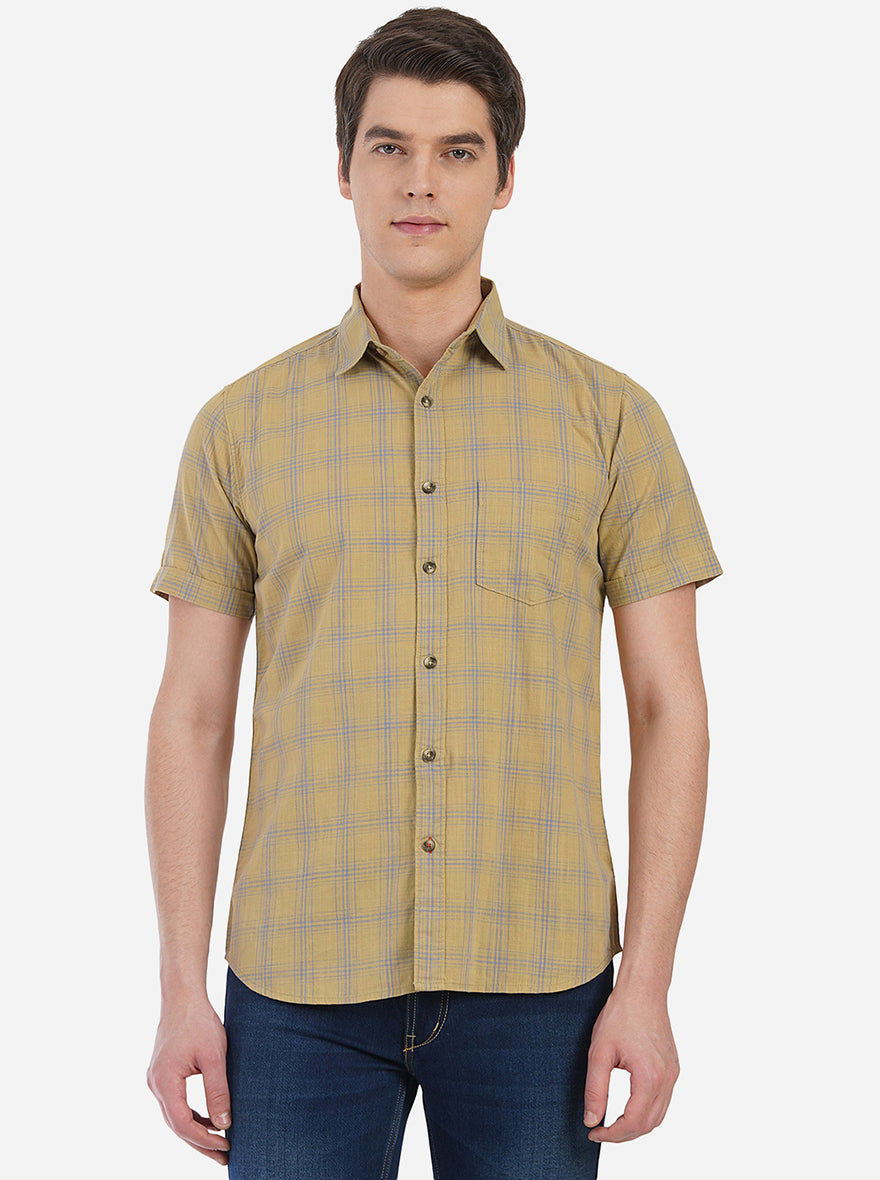 Details: Achieve the best casual style when you dress up in this checked tapenade brown semi casual shirt by JadeBlue. This slim fit shirt is made to perfection from breathable cotton fabric, which absorbs sweat and keeps you dry all day long. This shirt features front buttons placket, shirt collar, half sleeves, chest pocket and curved hem, which lends it a functional touch. Pair it with black jeans, shades, watch and sneakers to look and feel comfortable, wherever you go. Shop for this wardrobe essential now!