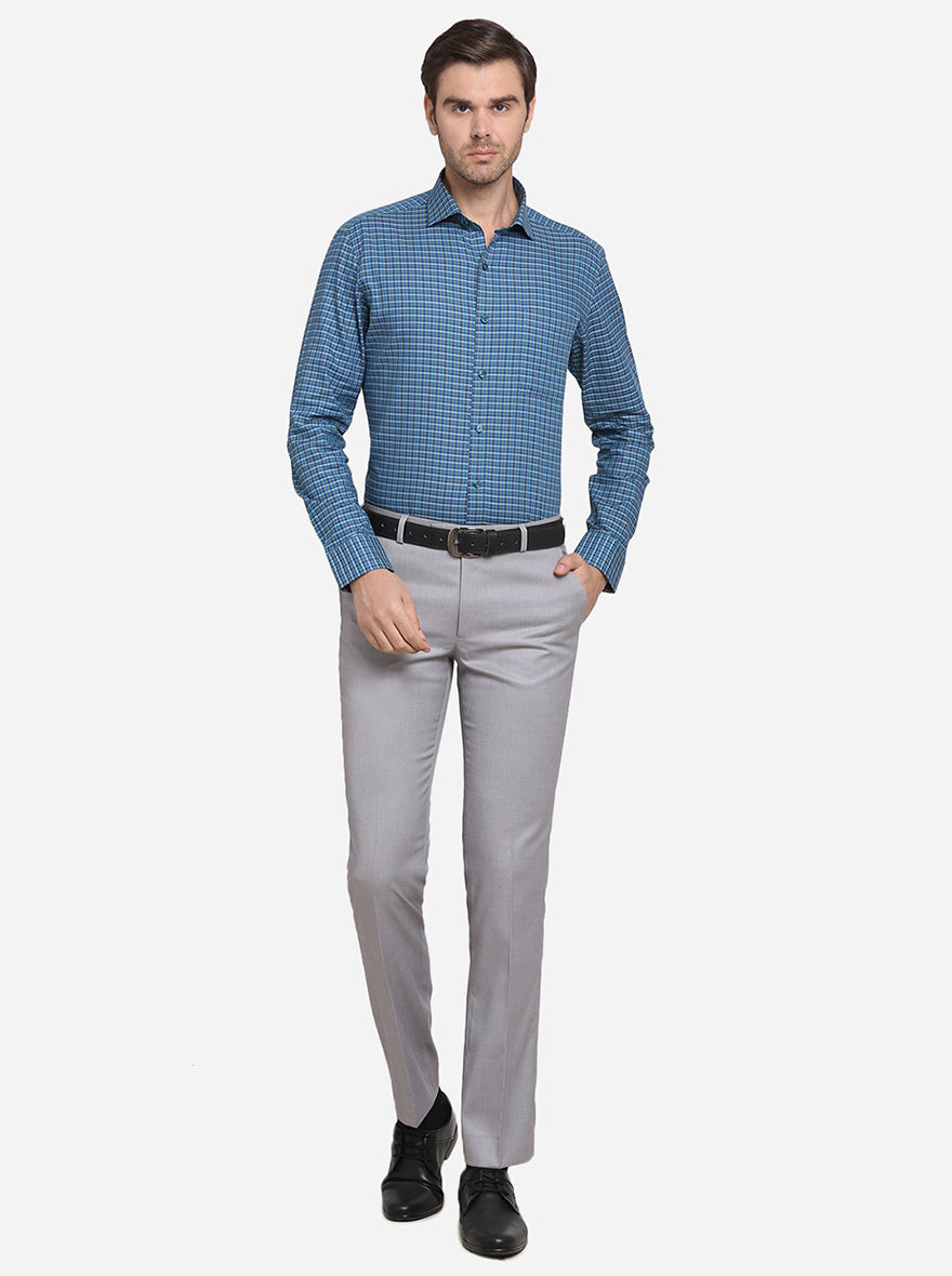 Teal Blue & Grey Checked Slim Fit Formal Shirt | JadeBlue