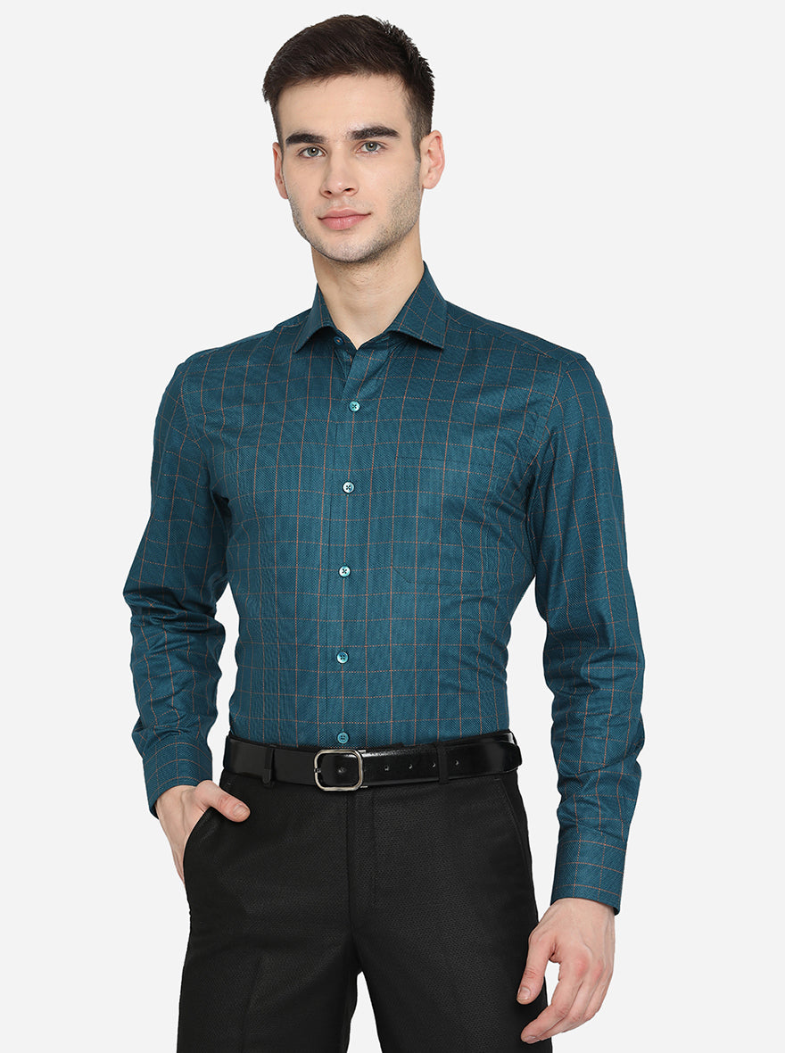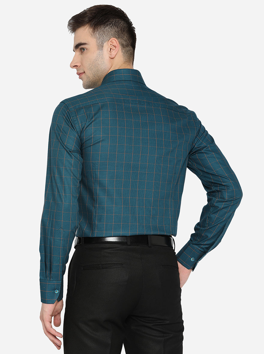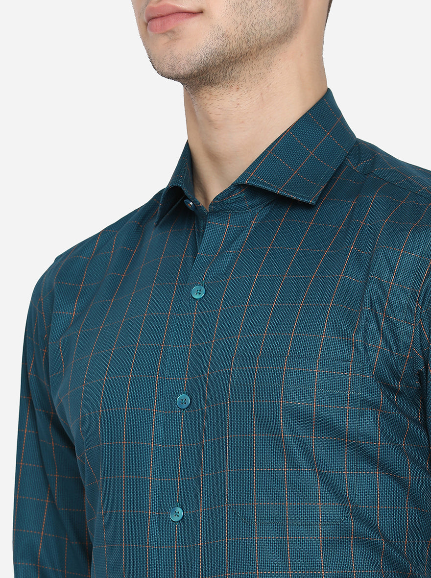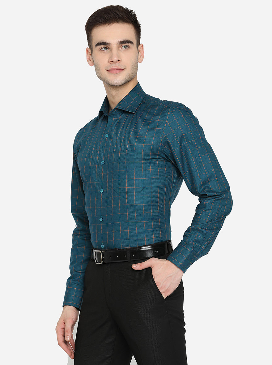 Teal Green Checked Slim Fit Formal Shirt | Metal