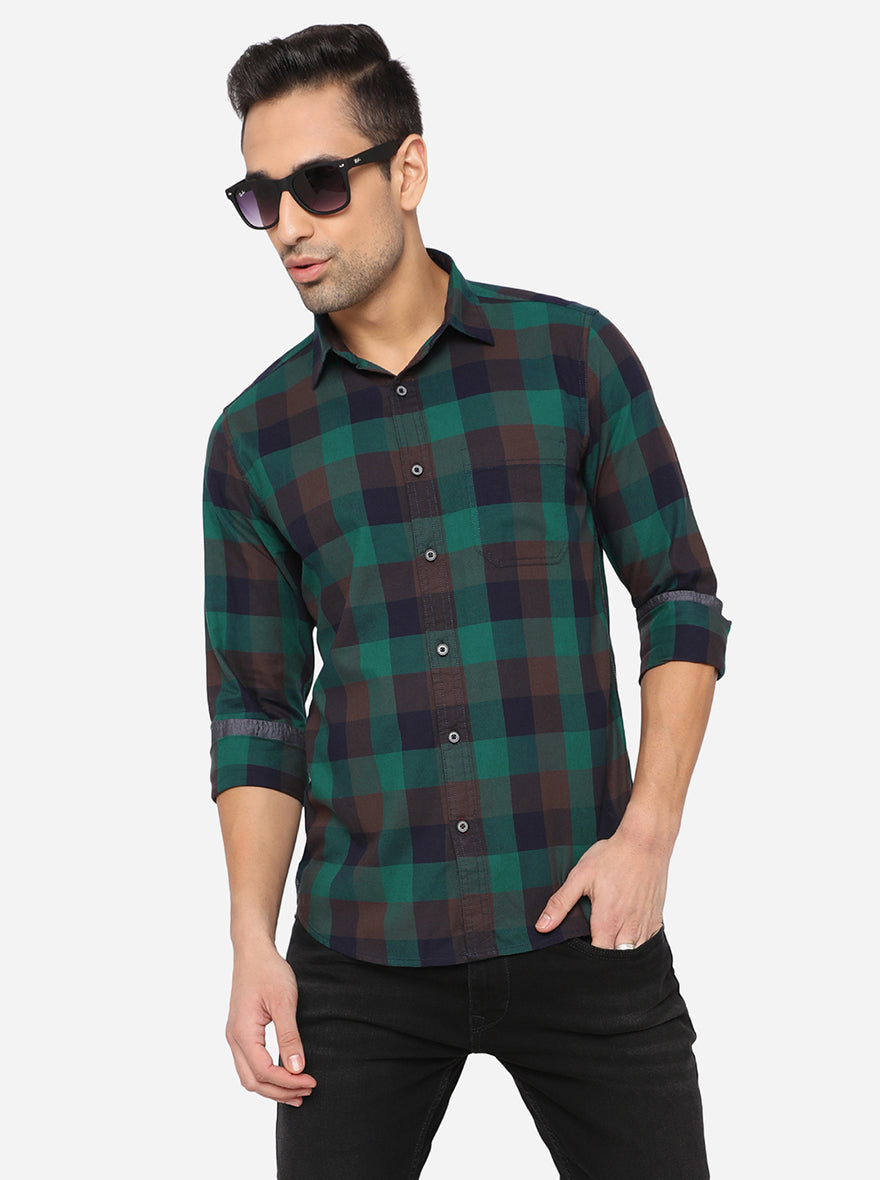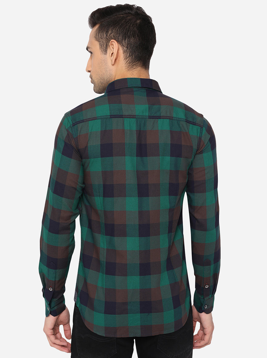 Details: Its time to up your style game wearing this Teal Green Shirt from the latest collection of JadeBlue Sport. It features a shirt collar, button placket, full-sleeves and offers a slim-fit. It is adorned with a checked pattern, making up for a classy choice. Perfect for semi-casual wear or weekend wear. Crafted with pure cotton, it promises a soft touch against the skin and a comfort like no other. Team it with a well-fitted blue denim and smart sneakers to create a stylish attire.