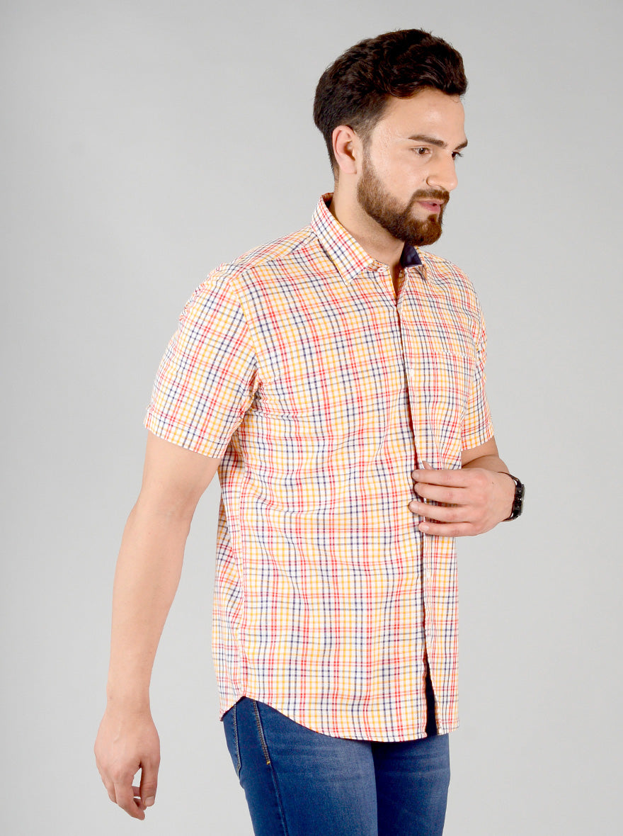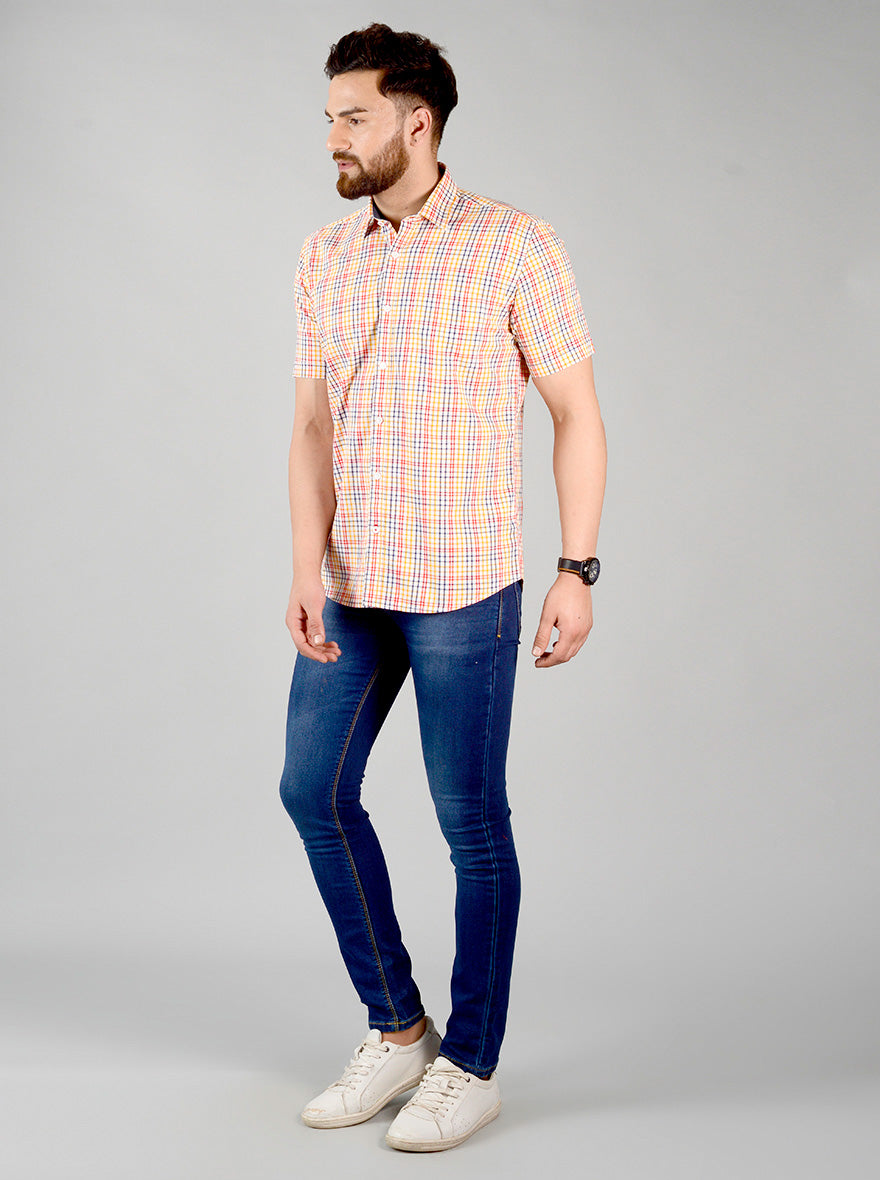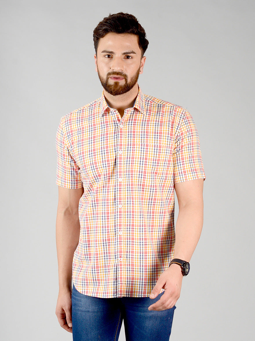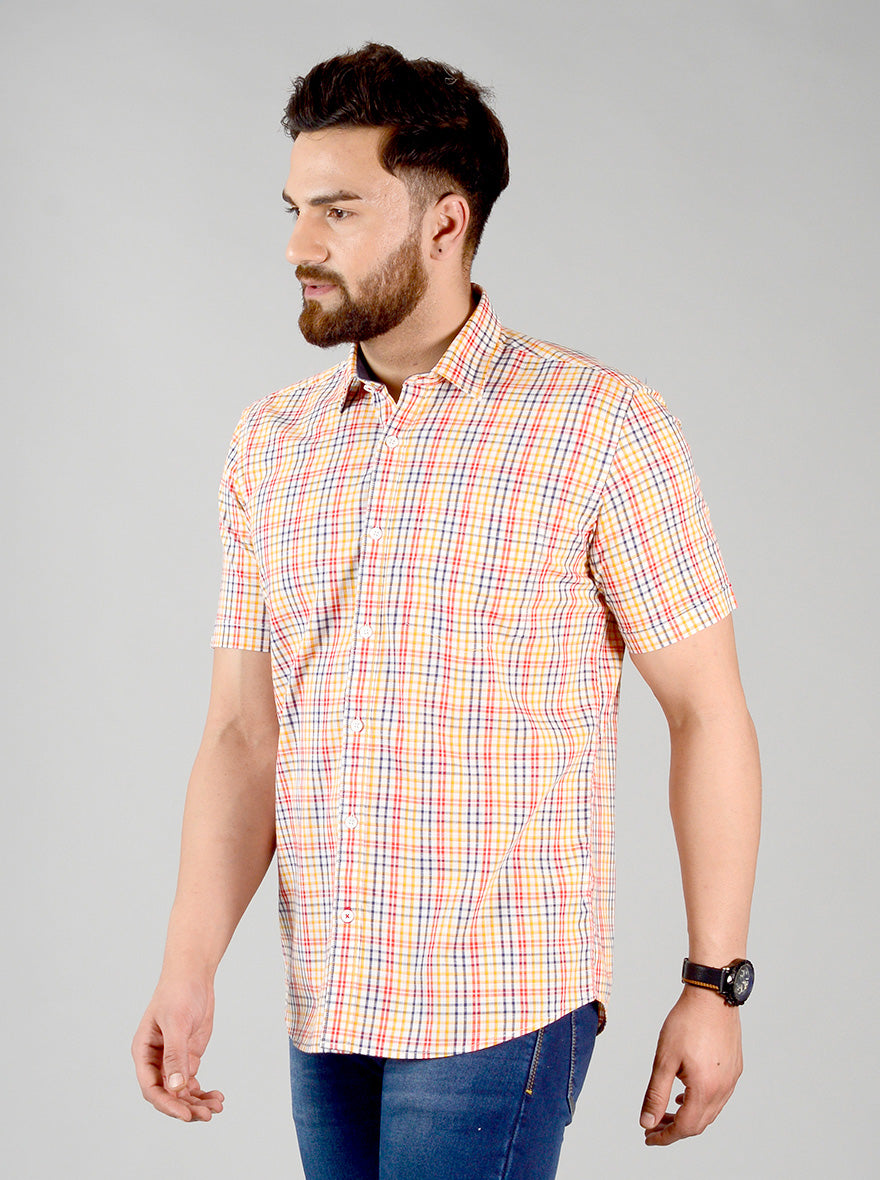 Details: This yellow checked casual shirt will elevate your casual style in a distinct way. Made from breathable cotton fabric, this slim fit shirt features shirt collar, chest pocket and half sleeves.