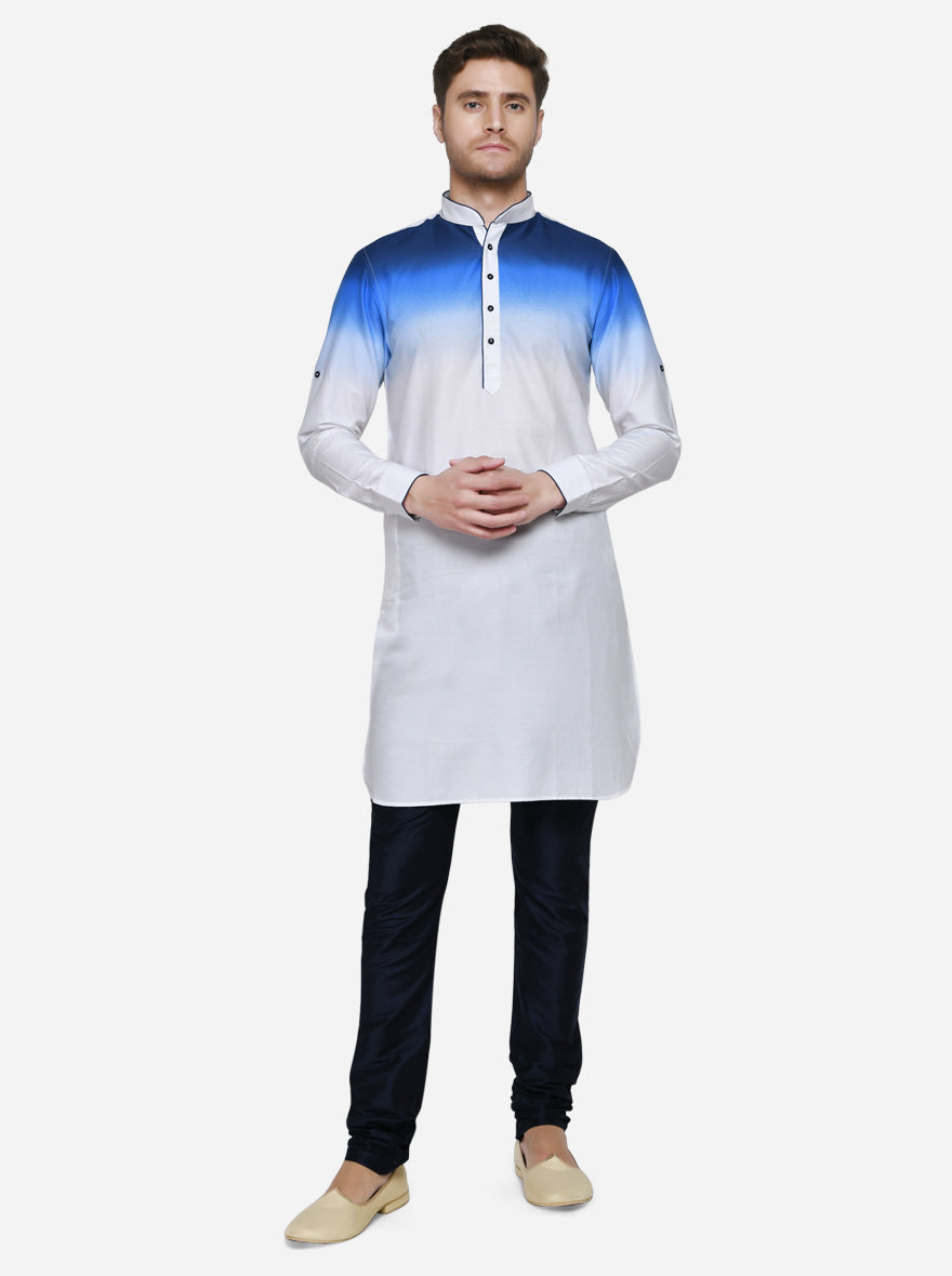 Details: Dress up in this super classy Ombre White & Blue kurta. Add a stylish edge to your casuals wear collection by opting for this Ombre White & Blue kurta. This piece is stitched with basic features and lets you stay fashionable and comfortable all day long. Pair it up with denims or casual trousers/chinos. Made to perfection, this regular fit kurta is styled with basic features and offers all-day comfort. Own itLet your style do the talking for you when you step out wearing this appealing White & Blue Ombre kurta. This regular fit kurta will become your wardrobe favorite, owing to its impeccable features.
