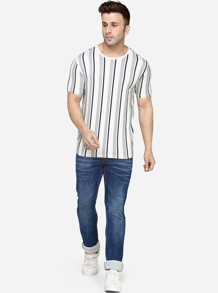 Details: Cast an everlasting impression on the onlookers, when you step out in this White & Blue Round Neck T-shirt. Made from breathable 100% Cotton fabric, this Slim Fit T shirt will become your favorite soon, thanks to its stunning features. This men's T shirt is made from premium fabric and let you spend whole day in utmost comfort and style. Opt for this must-have Printed White & Blue T-Shirt & be ready to stay in style. Made to perfection, this Slim Fit men's T shirt will prove to be perfect companion for your jeans, casual trousers and shorts.Fetch compliments for your style sense when you wear this men's T-shirt. Made to perfection, this T-shirt will elevate your style in a remarkable way. Style this piece with navy blue trousers.