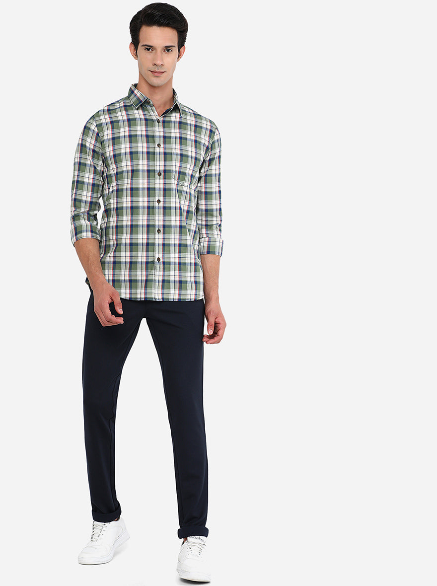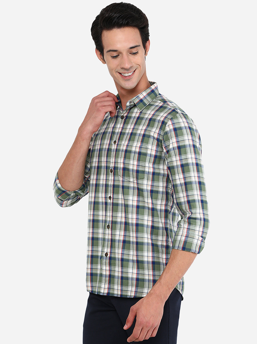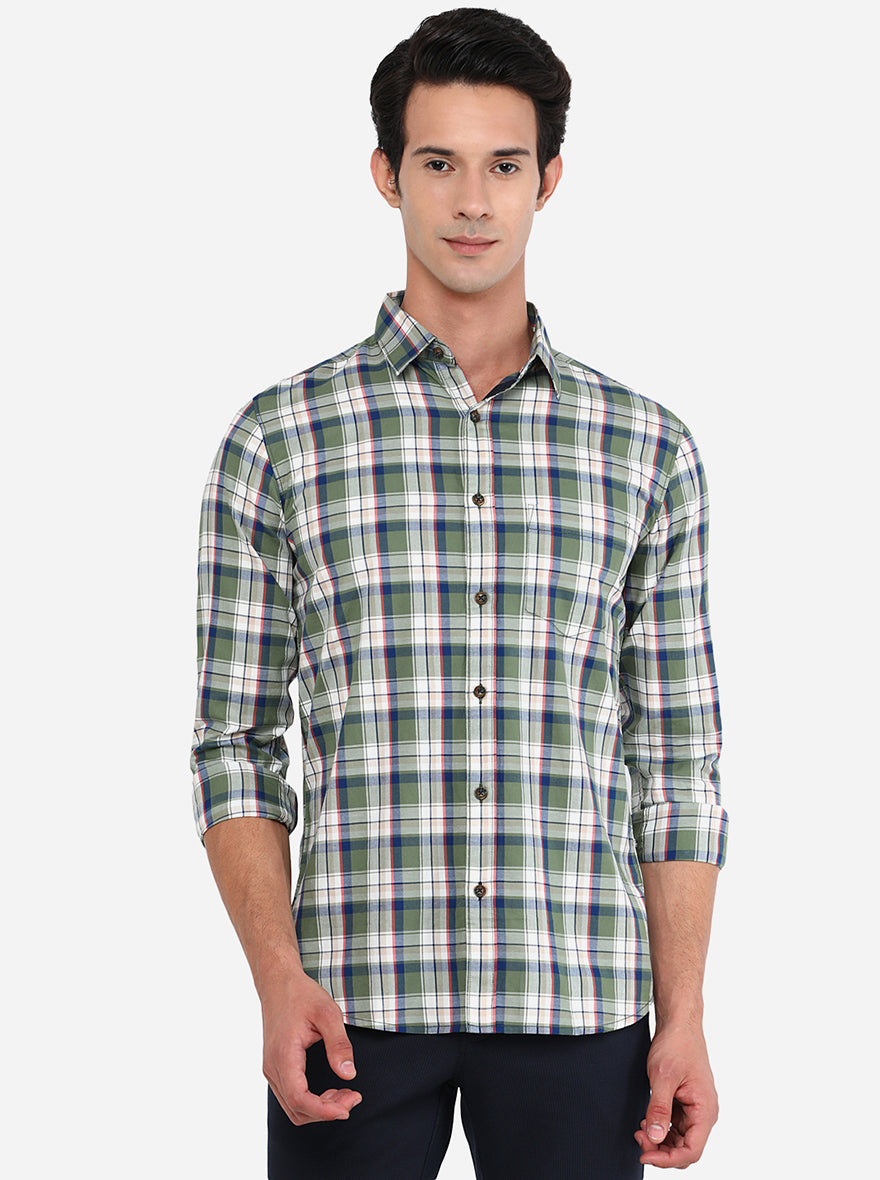 Details: This White & Green Semi Casual Shirt from JadeBlue is designed with contrasting shade checks. Fabricated with 100% Cotton promises a comfortable and breathable wearing experience. Offers a slim fit for a sleek look which has been elevated with a Checked pattern. Features with a chest pocket, Full sleeves, and a regular shirt collar. Match it with the well-fitted trousers of your choice and a pair of oxford shoes and you are ready to go.