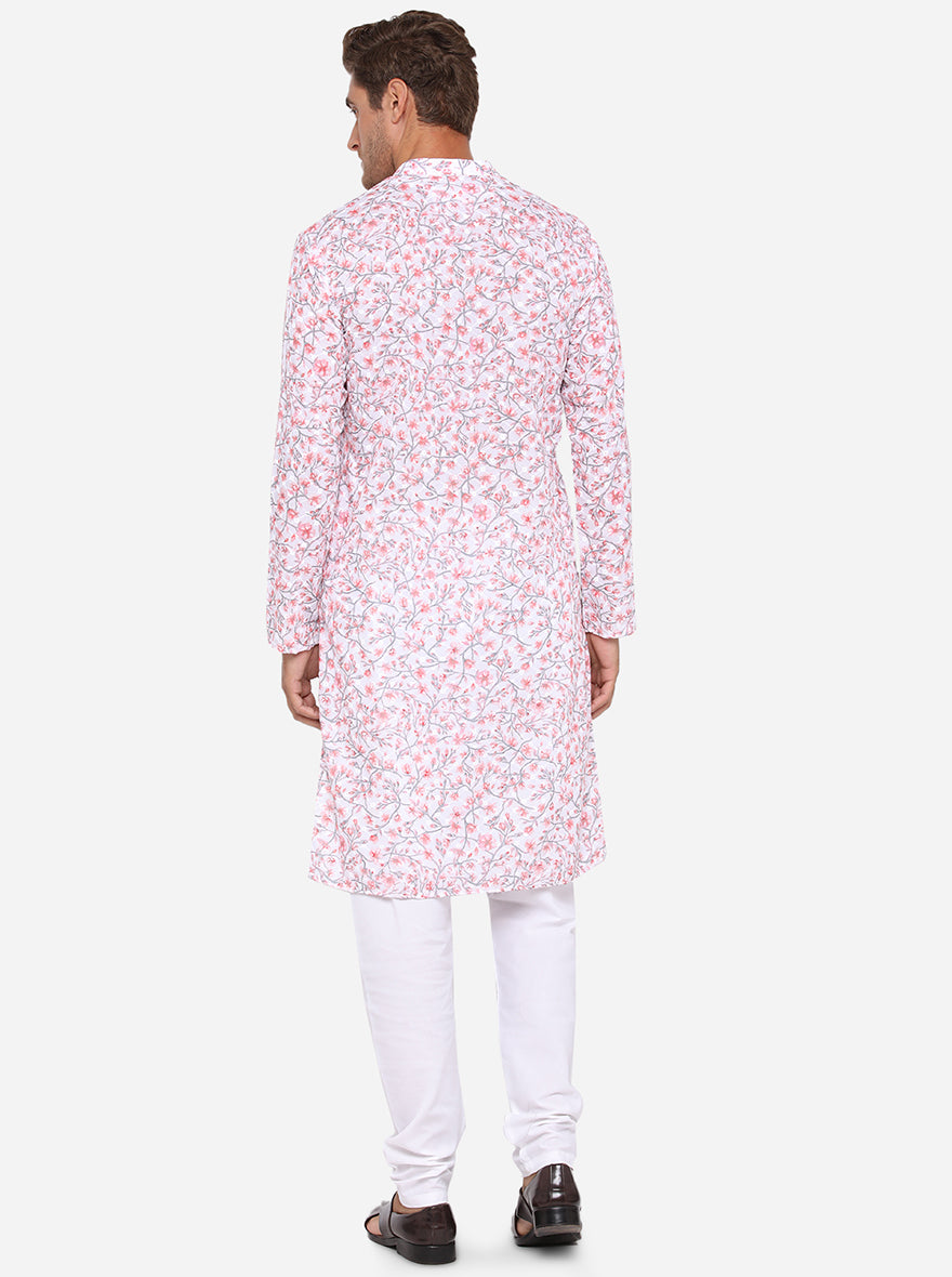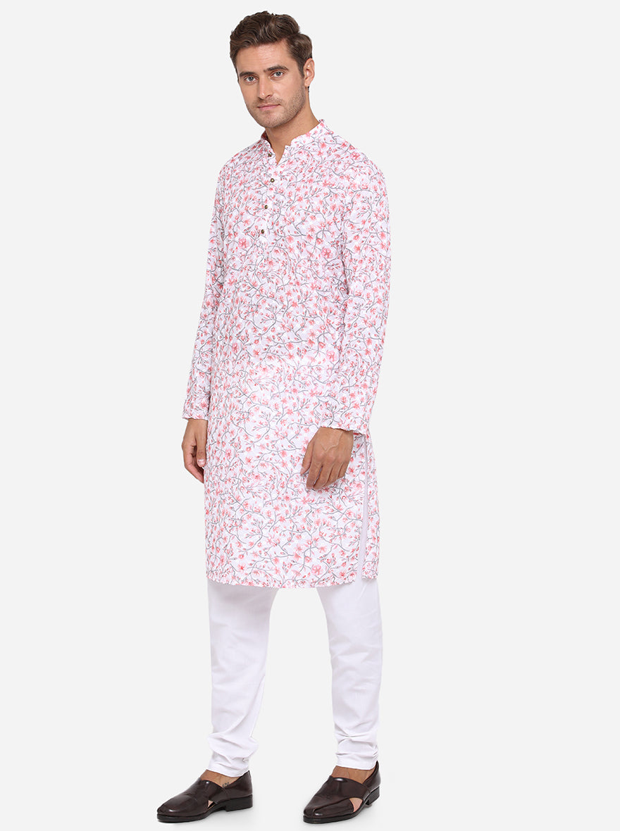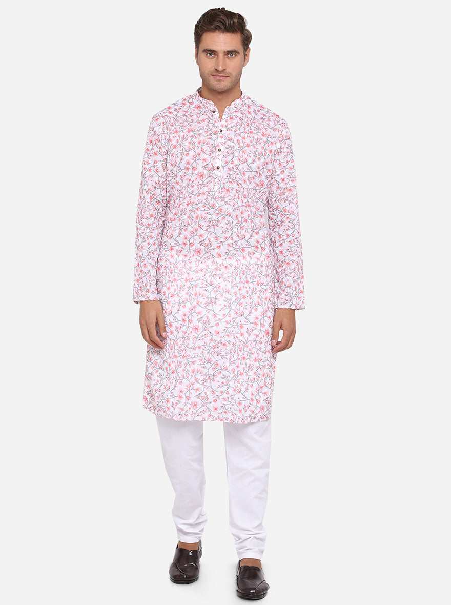 Details: Let your outfit do all the talking in this white and pink kurta from the latest collection of Azania. It features a mandarin collar, full-sleeves and offers a regular fit. Has buttons on the front. It is adorned with a floral printed pattern, it makes up for a charming choice. The set includes a contrast White solid churidaar in it. Crafted with rich cotton blend, it assures you the best of comfort. Perfect for Indian parties, festivals and weddings. Match it with a pair of jutti and you are all set to go.
