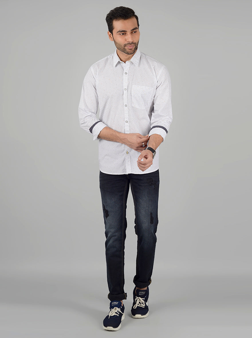 Details: Achieve captivating look in a snap by donning this white printed casual shirt. This cotton slim fit shirt features contrast print cuffs, which adds to its beauty. Pair this alluring piece with black jeans and loafers.