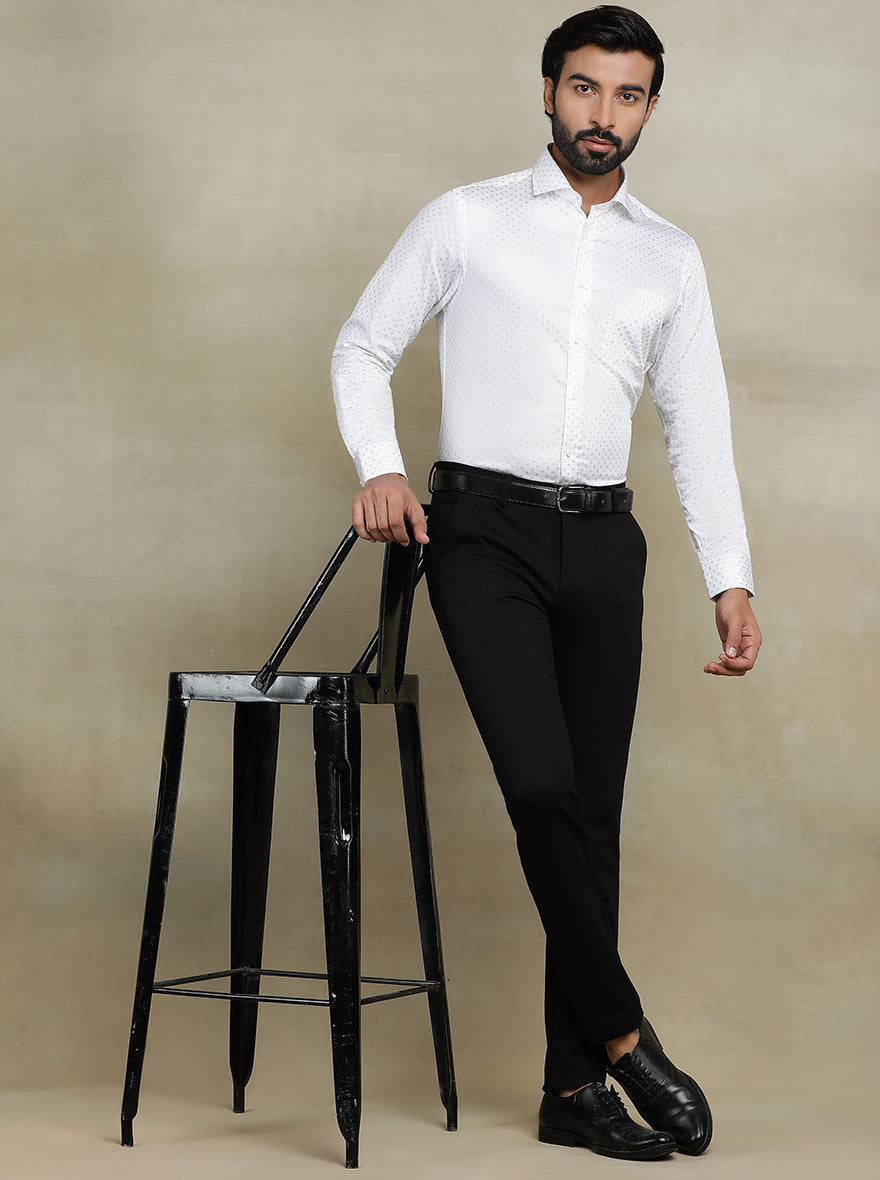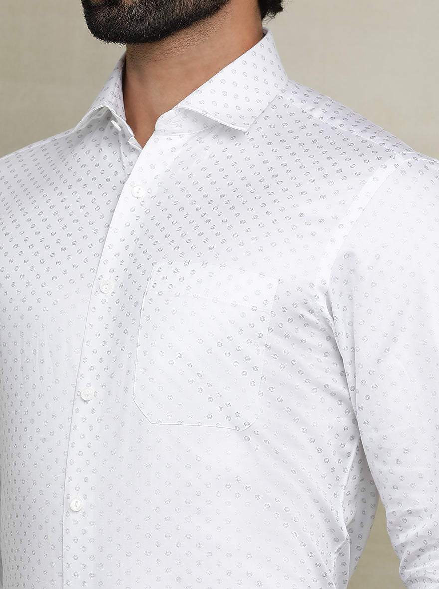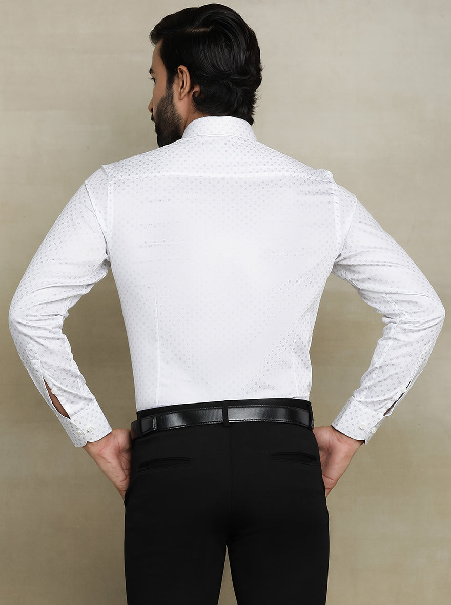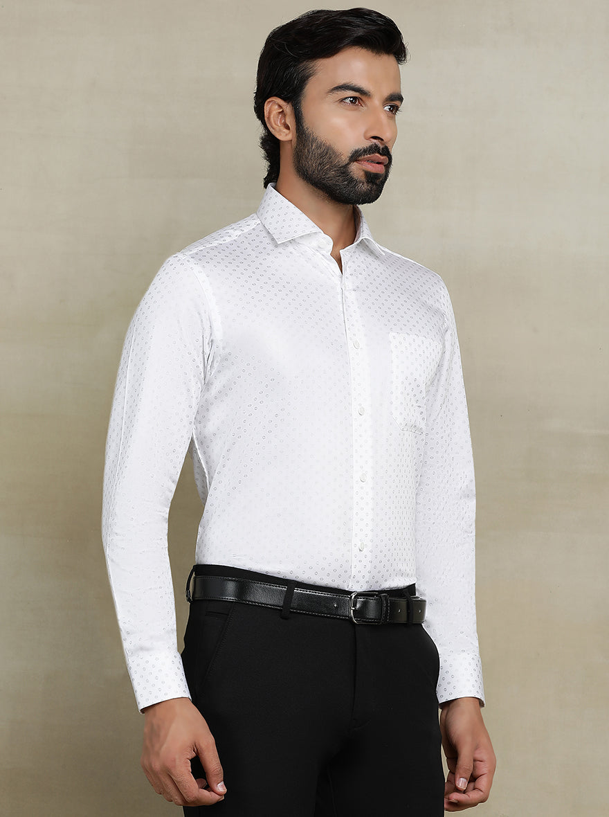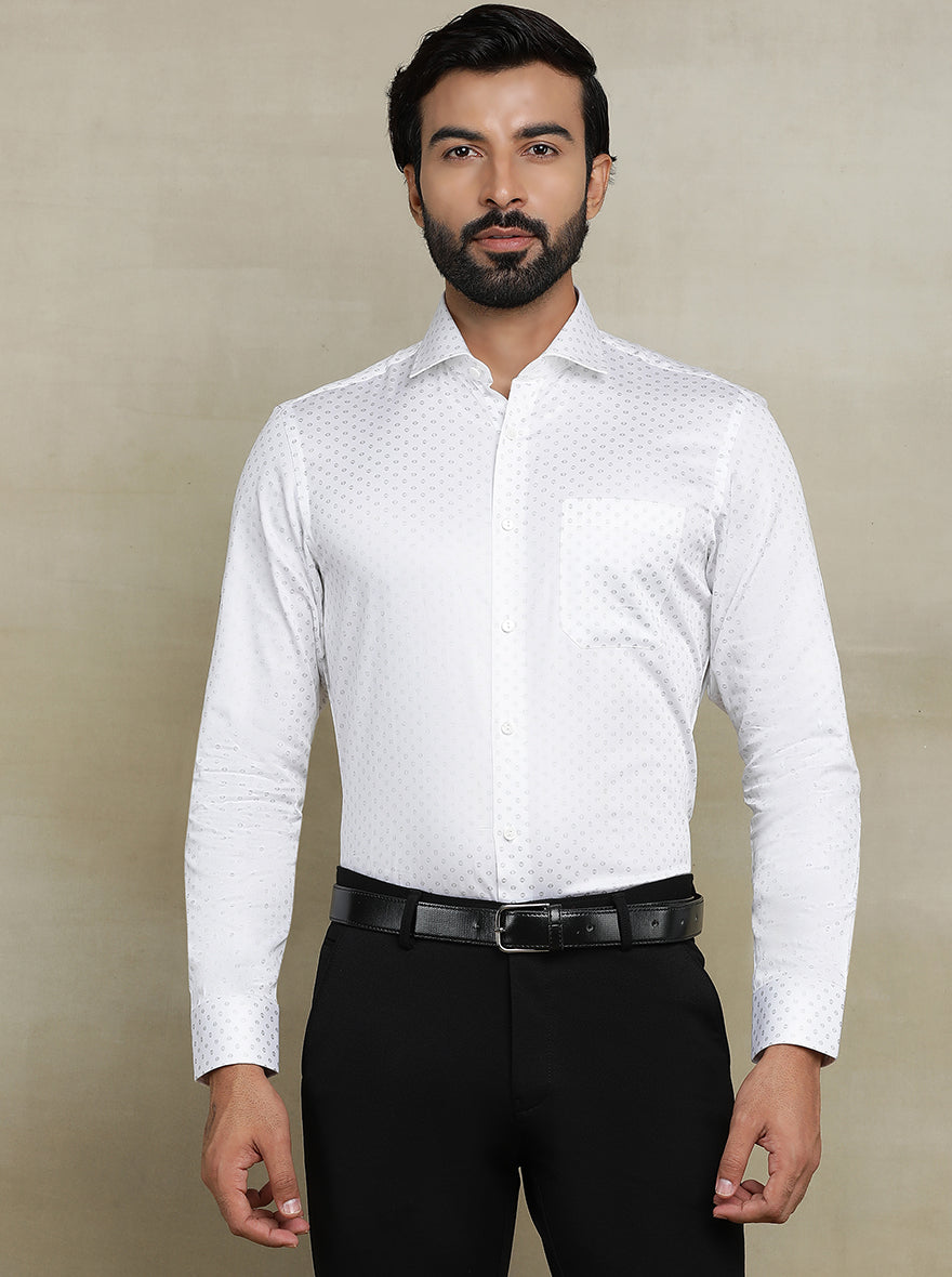 Details: Enhance your wardrobe with the Metal Formal Shirt in White. Made from luxurious 100% Cotton, this Slim Fit Formal Shirt features a classic Printed design. The Full Sleeve sleeves and Regular collar add to its charm, making it perfect for any occasion.