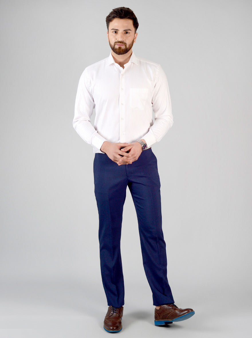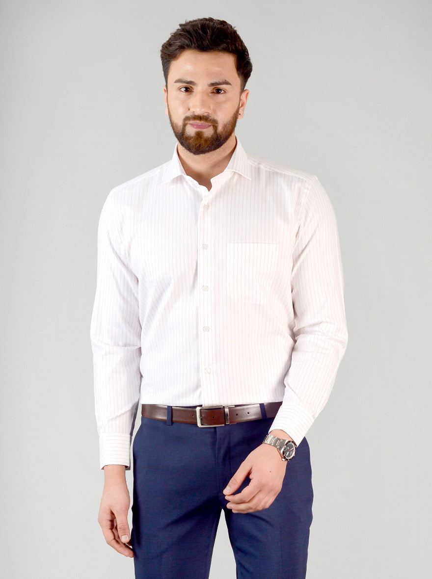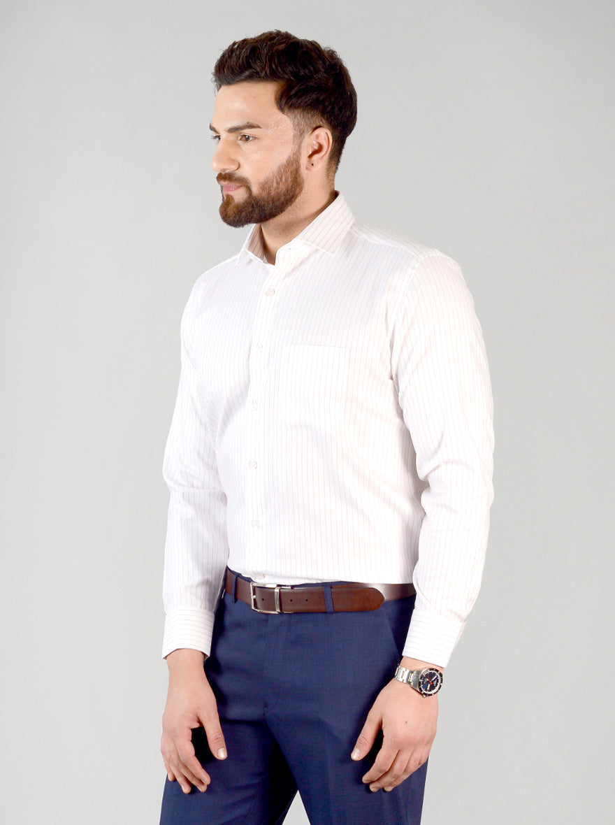 Details: This white striped shirt will let you dress up for work in utmost style. This formal shirt is tailored using cotton fabric and features chest pocket, shirt collar and front buttons for closure. Fashion conscious men should not miss on buying this piece.