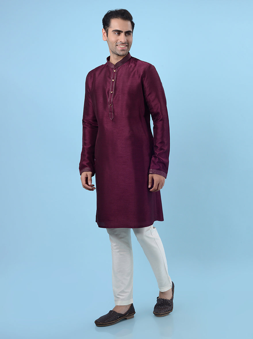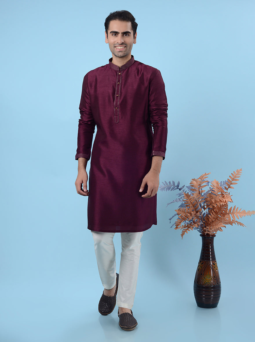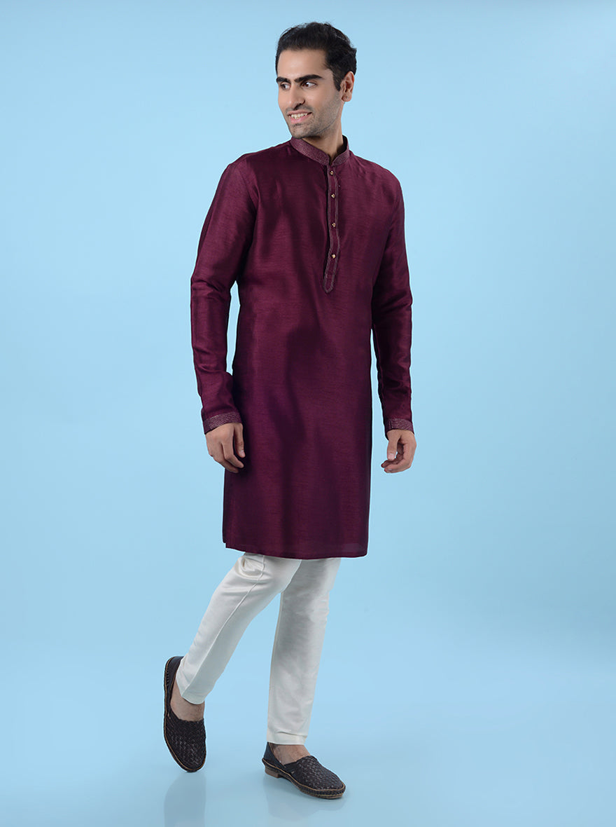 Details: Elevate your traditional attire with Azania's Men's Wine Kurta Pajama, a perfect blend of luxury and comfort. Our sophisticated collection effortlessly combines classic style with contemporary elegance, ensuring you make a lasting impression at any festive occasion. Crafted from a premium silk blend fabric, this kurta pajama boasts a regular fit with a classic, straight cut that exudes sophistication. The solid wine color adds a touch of richness to your wardrobe, while the full sleeves and Mandarin collar complete the look with grace. Whether you're attending a wedding or special event, rest assured that our Kurta Pajama by Azania will enhance your style and boost your confidence in every step you take. Choose Azania for an option that is both versatile and timeless, because we understand that what you wear truly matters.