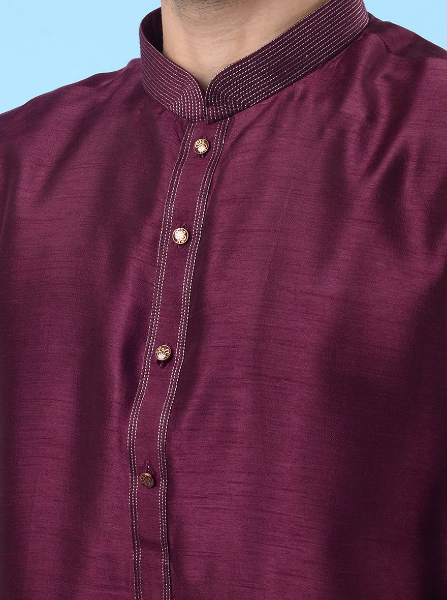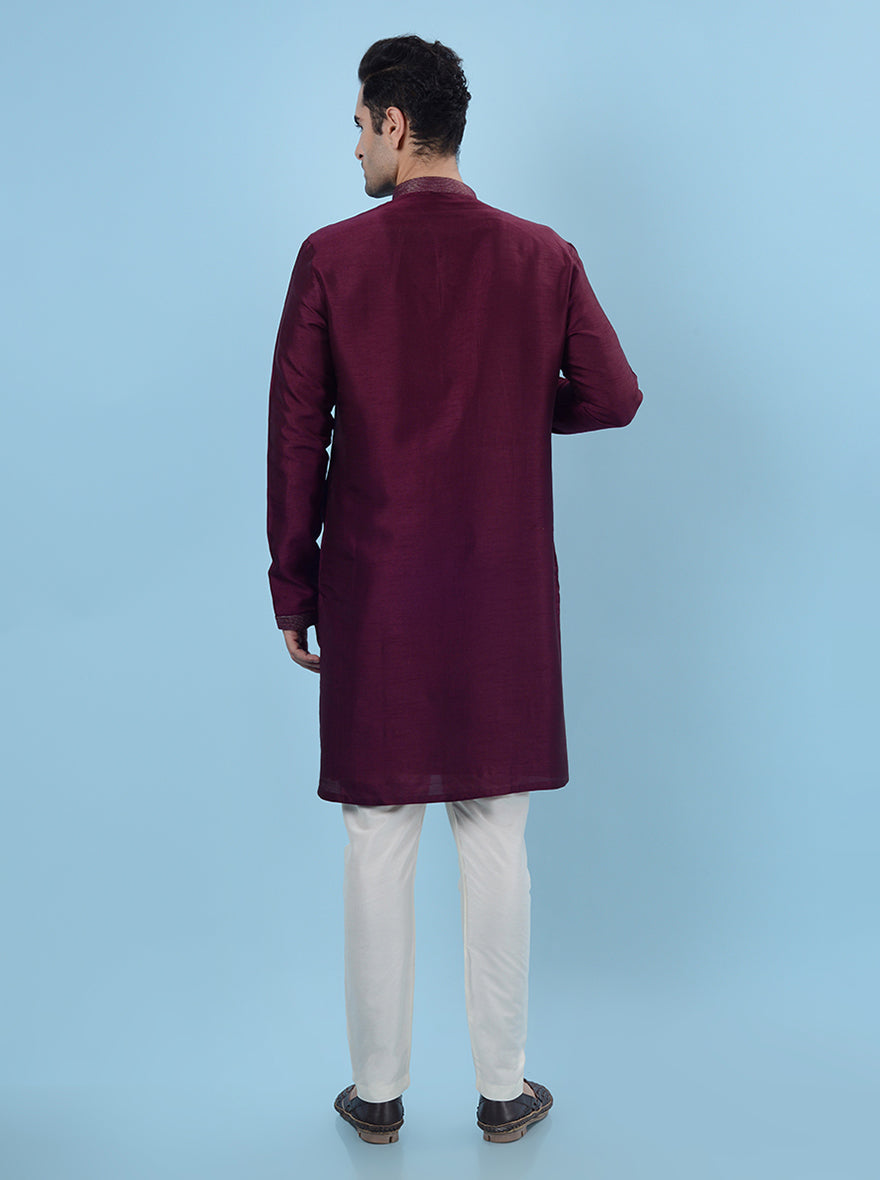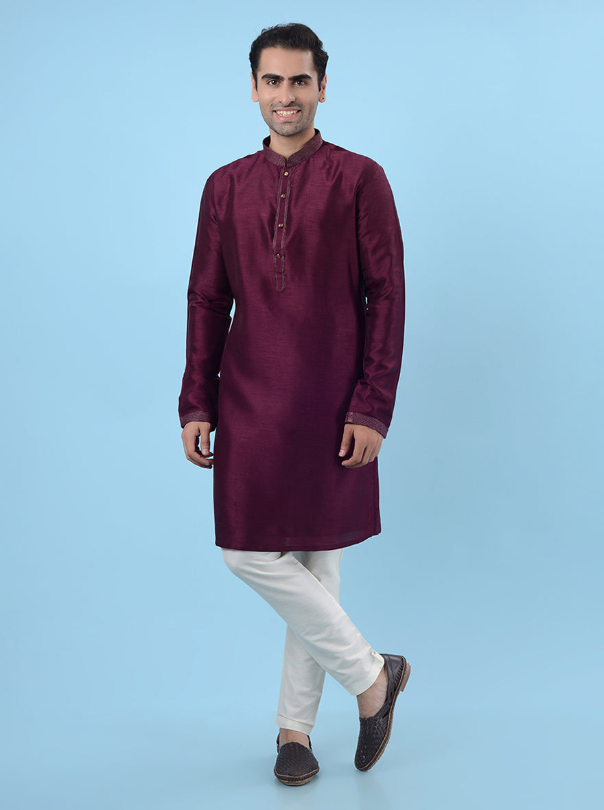 Details: Elevate your traditional attire with Azania's Men's Wine Kurta Pajama, a perfect blend of luxury and comfort. Our sophisticated collection effortlessly combines classic style with contemporary elegance, ensuring you make a lasting impression at any festive occasion. Crafted from a premium silk blend fabric, this kurta pajama boasts a regular fit with a classic, straight cut that exudes sophistication. The solid wine color adds a touch of richness to your wardrobe, while the full sleeves and Mandarin collar complete the look with grace. Whether you're attending a wedding or special event, rest assured that our Kurta Pajama by Azania will enhance your style and boost your confidence in every step you take. Choose Azania for an option that is both versatile and timeless, because we understand that what you wear truly matters.