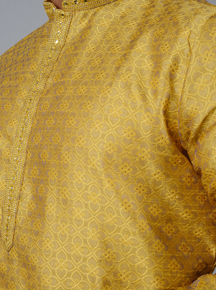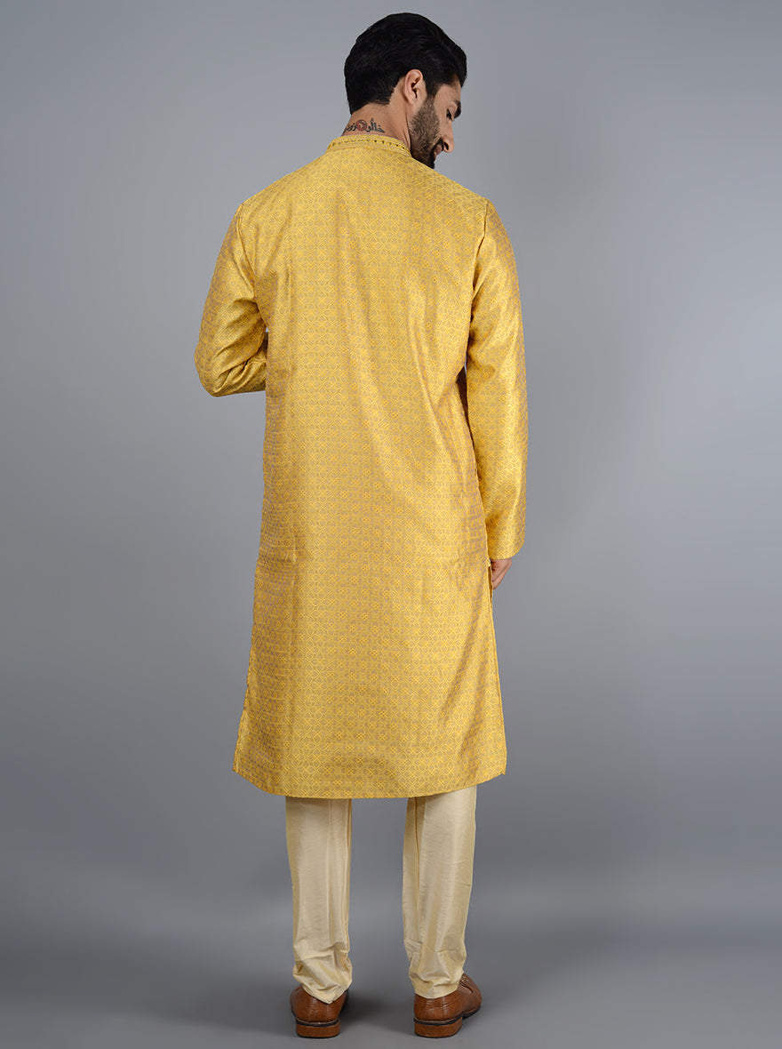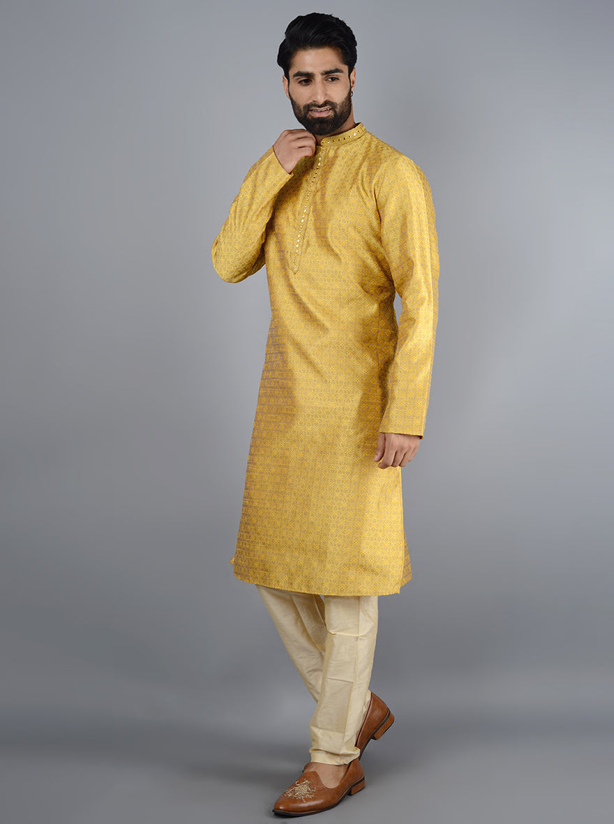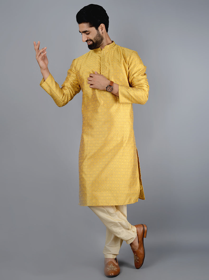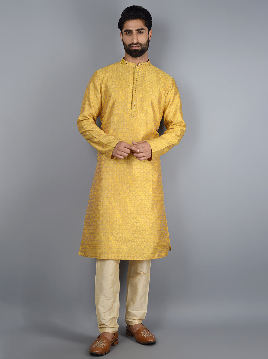 Details: Nothing is as auspicious as the color yellow and this beautifully crafted Kurta Set from Azania is one such kurta set. Crafted with exceptionally soft Silk Jacquard fabric that will provide an elegant and Royal look. Features full sleeves and a collar. Offers a Straight fit for Kurta and pajama which has been elevated with thread embroidery work. Team it with an Aligarhi to finish the traditional look.